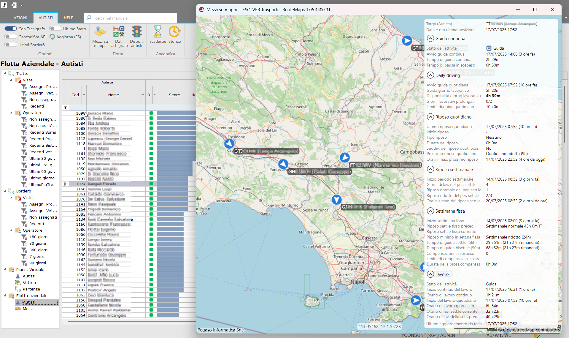 Grazie alle integrazioni, ESOLVER Trasporti porta i dati del tachigrafo e la posizione dei mezzi in tempo reale direttamente nel tuo ambiente di lavoro. Questa connessione abilita la funzionalità di Analisi Disponibilità Autisti, che valuta automaticamente chi può mettersi in viaggio applicando criteri bloccanti basati sulla prossimità del riposo settimanale o sull'insufficienza di ore di guida. Gli autisti idonei vengono poi ordinati tramite un punteggio che considera le ore di guida e lavoro residue, proponendoti sempre la risorsa più efficiente. Il tutto è completato da una mappa interattiva della flotta, che ti offre una visibilità completa per un controllo operativo senza precedenti.